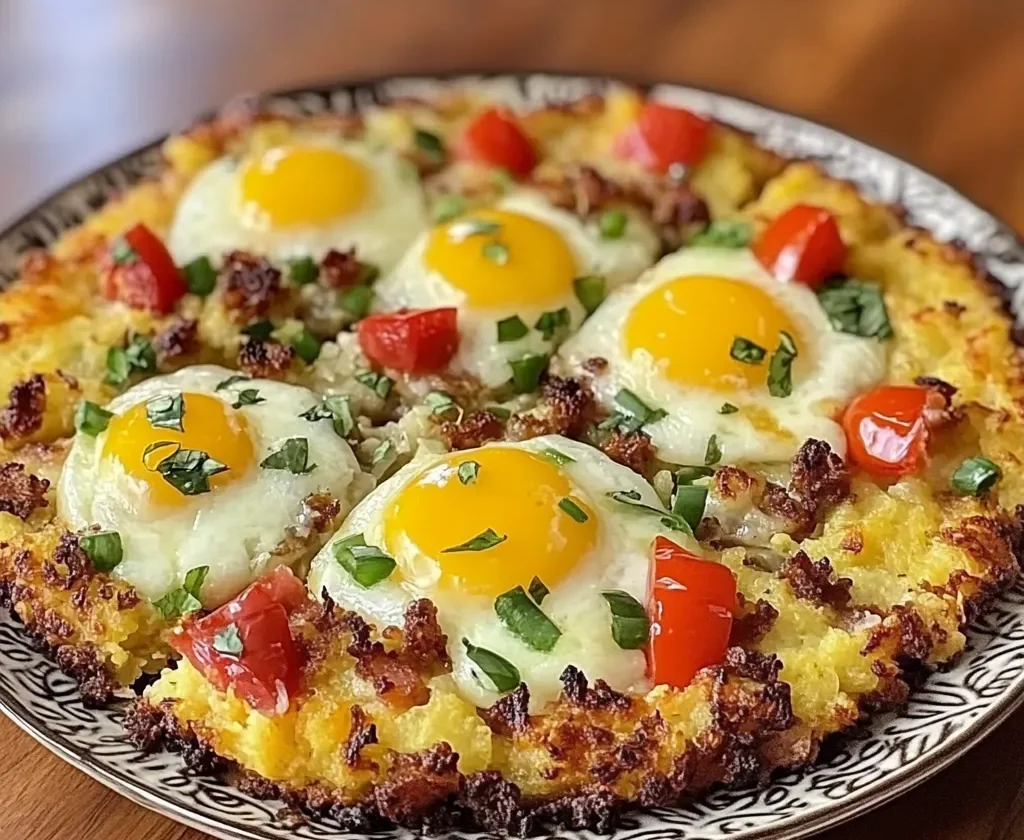 The Breakfast Pizza Hash Brown Crust combines a golden, crispy hash brown base with all your favorite breakfast toppings. Cheddar cheese melts over a layer of cooked sausage or bacon, diced bell peppers, and green onions, crowned with eggs baked to perfection. Quick to assemble and perfect for brunch or weekend mornings, this dish is a fun, hearty, and satisfying alternative to traditional breakfast fare.