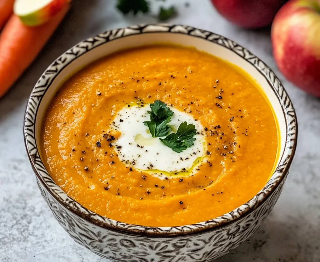 A silky, comforting Carrot Apple Ginger Soup made with roasted carrots, apples, and fresh ginger. Easy, flavorful, and perfect for cozy meals or meal prep.