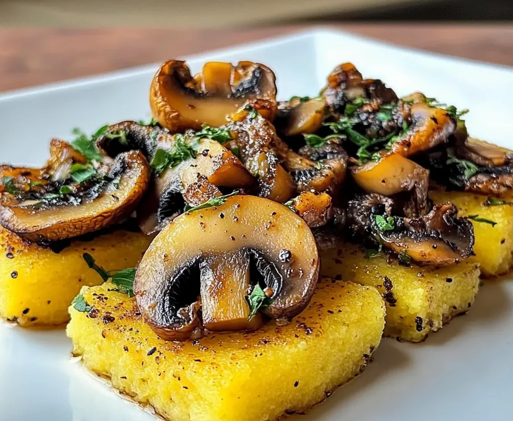 Crispy Polenta with Mixed Mushrooms is a rustic Italian-inspired dish featuring golden, crunchy polenta topped with garlicky sautéed mushrooms and Parmesan cheese.