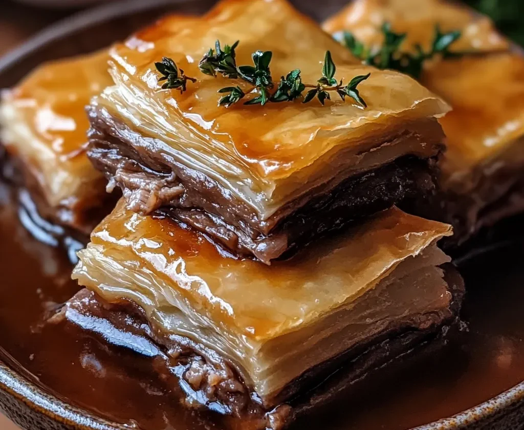 Cut the baked dish into squares and serve warm with small bowls of beef broth for dipping. Each bite delivers buttery pastry, savory beef, and melty cheese—classic French dip flavor in a fun new form.