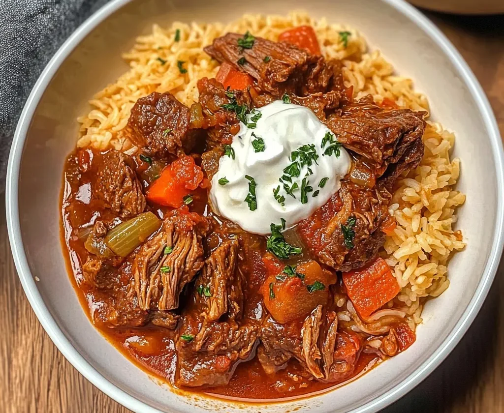 Giouvetsi Greek Beef Stew is a slow-simmered Mediterranean dish made with beef chuck, tomatoes, red wine, herbs, and orzo pasta. The beef becomes fork-tender as it cooks, while the orzo absorbs the rich tomato-wine broth, creating a thick, comforting stew. It’s a one-pot meal that’s hearty, flavorful, and perfect for cozy dinners or special occasions.