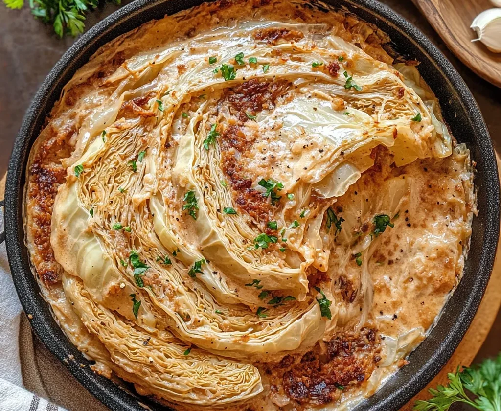Uncover the skillet, baste the cabbage with sauce, and bake for an additional 15–20 minutes until fork-tender. The cabbage should be soft, infused with the rich cream sauce, and slightly golden on the edges.