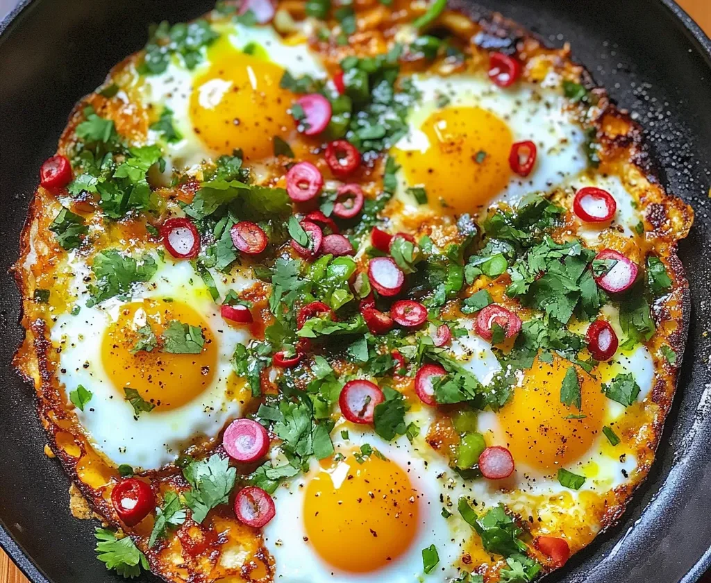 Reduce the heat to medium-low. Crack the eggs directly into the spiced oil. Sprinkle with a bit more salt, then top with the sliced Serrano or jalapeño, the remaining shallots, and some fresh cilantro.