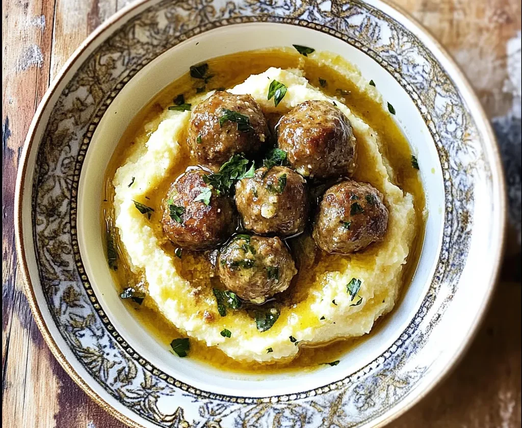 Ricotta Polenta with Drunken Meatballs is a hearty and indulgent dish featuring creamy polenta enriched with ricotta and Parmesan, topped with tender pork and beef meatballs simmered in a rich beer-based sauce. The dish is aromatic, flavorful, and perfect for impressing guests or enjoying a comforting weeknight meal. Garnished with fresh chives, it’s both visually appealing and utterly satisfying.