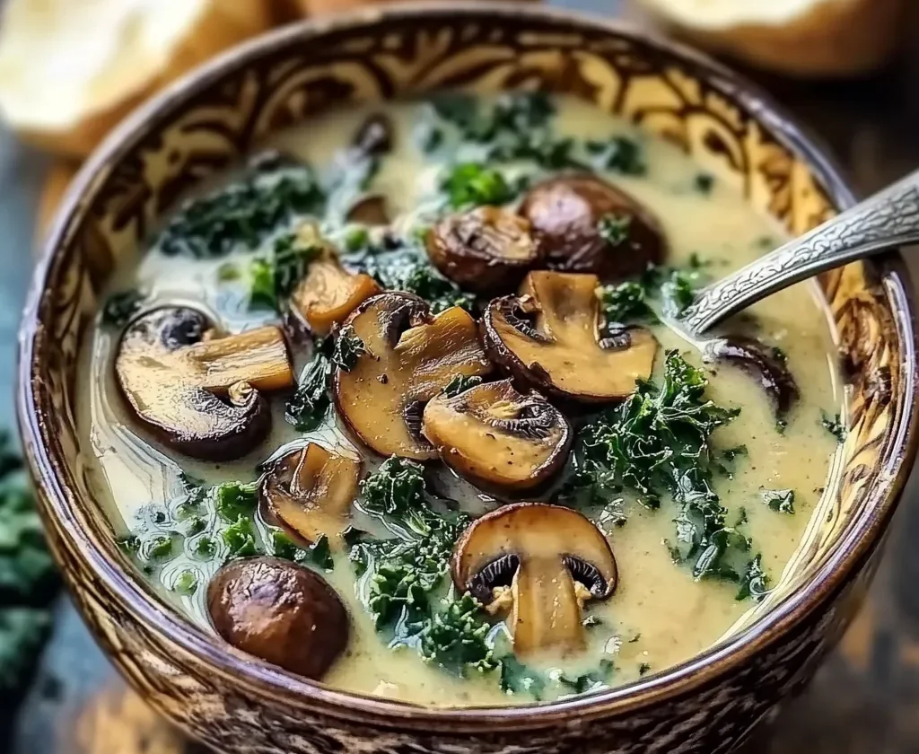 A rich and comforting Wild Mushroom, Caramelized Onion & Kale Soup made with caramelized onions, earthy mushrooms, tender kale, and creamy coconut milk. Easy, nourishing, and perfect for cozy meals.